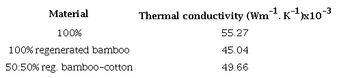 In this study, thermal properties of a 30 tex yarn from a blends of 100% fiber of regenerated bamboo, 100% fiber od cotton an 50.50% fiber of regenerated bamboo: cotton were used to compare bamboo and cotton performance in warm environment. Four physical activities, characterized by their metabolic rate, were used in the calculations.