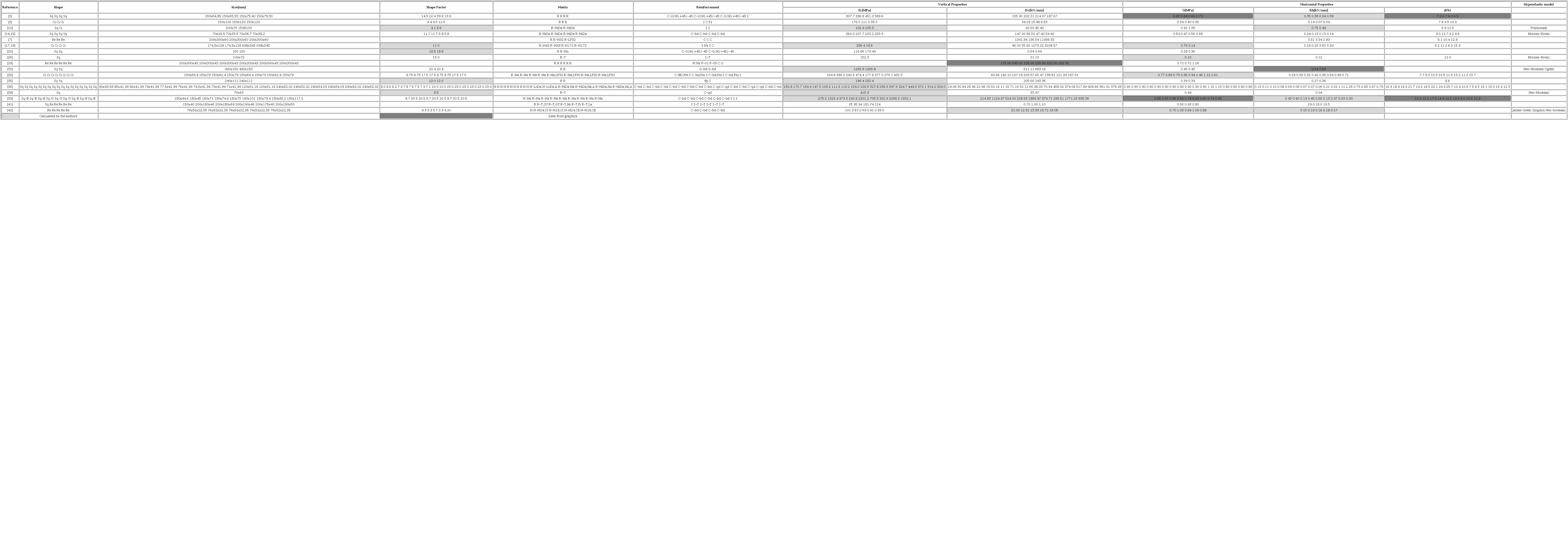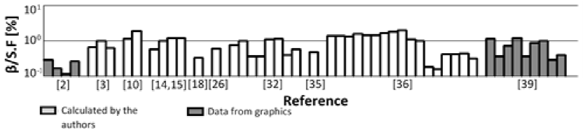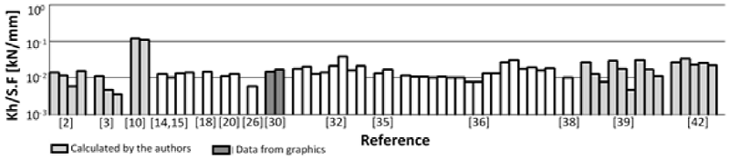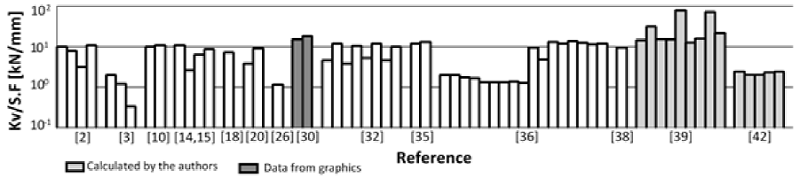 In Table 1 and Figures 1 to 3, the results obtained in each of the aforementioned studies are shown and they are enumerated according to the order of appearance in the reference list. Several mechanical properties were calculated by the authors taking into account these results and the equations 𝐾𝑣=𝐸𝑐𝐴/𝑡𝑟 and 𝐾ℎ=𝐺𝐴/𝑡𝑟,; where 𝐾𝑣 is the vertical stiffness of the rubber bearing, 𝐾ℎ is the horizontal stiffness, 𝐴 is the loaded area of the bearing, 𝑡𝑟 is the total thickness of rubber in the bearing, 𝐸𝑐 is the instantaneous compression modulus of the composite under the specified level of vertical load, and 𝐺 is the shear modulus of the rubber (Kelly & Konstantinidis, 2011).