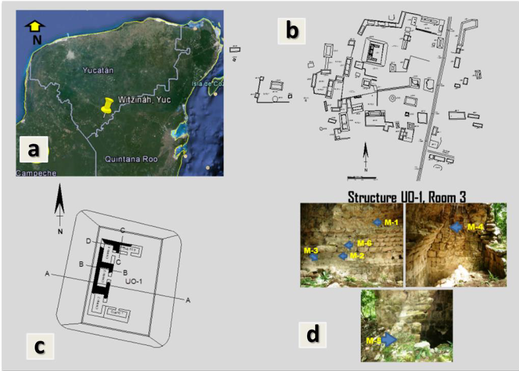 Witzinah, dated 800 A.C., is located in Peto county in south Yucatan State in Mexico also known as “South Cone” (Cono Sur) approximately 164 Km from Merida Capital City. Witzinah presents a total of 50 Prehispanic structures distributed in a surface of 77,243 m2 and it is formed by edifications generally oriented at 10º NE, meanwhile the rest exhibit small variations (349º NW). Main structure (UO-1) is a pyramidal basement in a 14 m high slope, its architectural plant is 35 m by side and above there is a “C” shape structure that was constituted by five rooms with overhang covers, three in the main part of the building and one in each lateral side. Figure 1 exhibits Witzinah archeological site and location of evaluated stuccos.