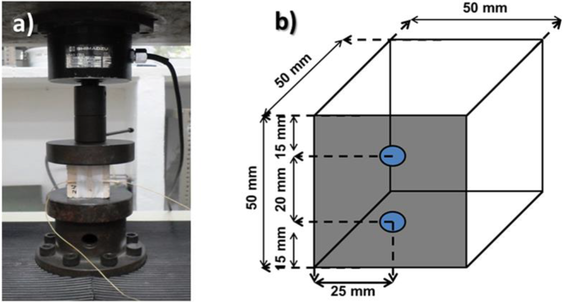 Compression test was carried out in five experimental mortars samples per formulation using a universal testing machine Shimadzu AG-I, with a load cell of 5 KN at room temperature with humidity of 80 to 90% and a crosshead speed 0.4 mm/min until fracture. Acoustic emission equipment, model MICRO 11PCl-2 was used in order to monitor the mechanical tests in real time to identify the failure mechanisms. Piezoelectric peak sensors were fixed on one side of the cube leaving 20 mm between them using silicone grease as coupling agent. Threshold was set at 20 dB, with a gain of 40 dB to determine the onset of failure (Figure 2).