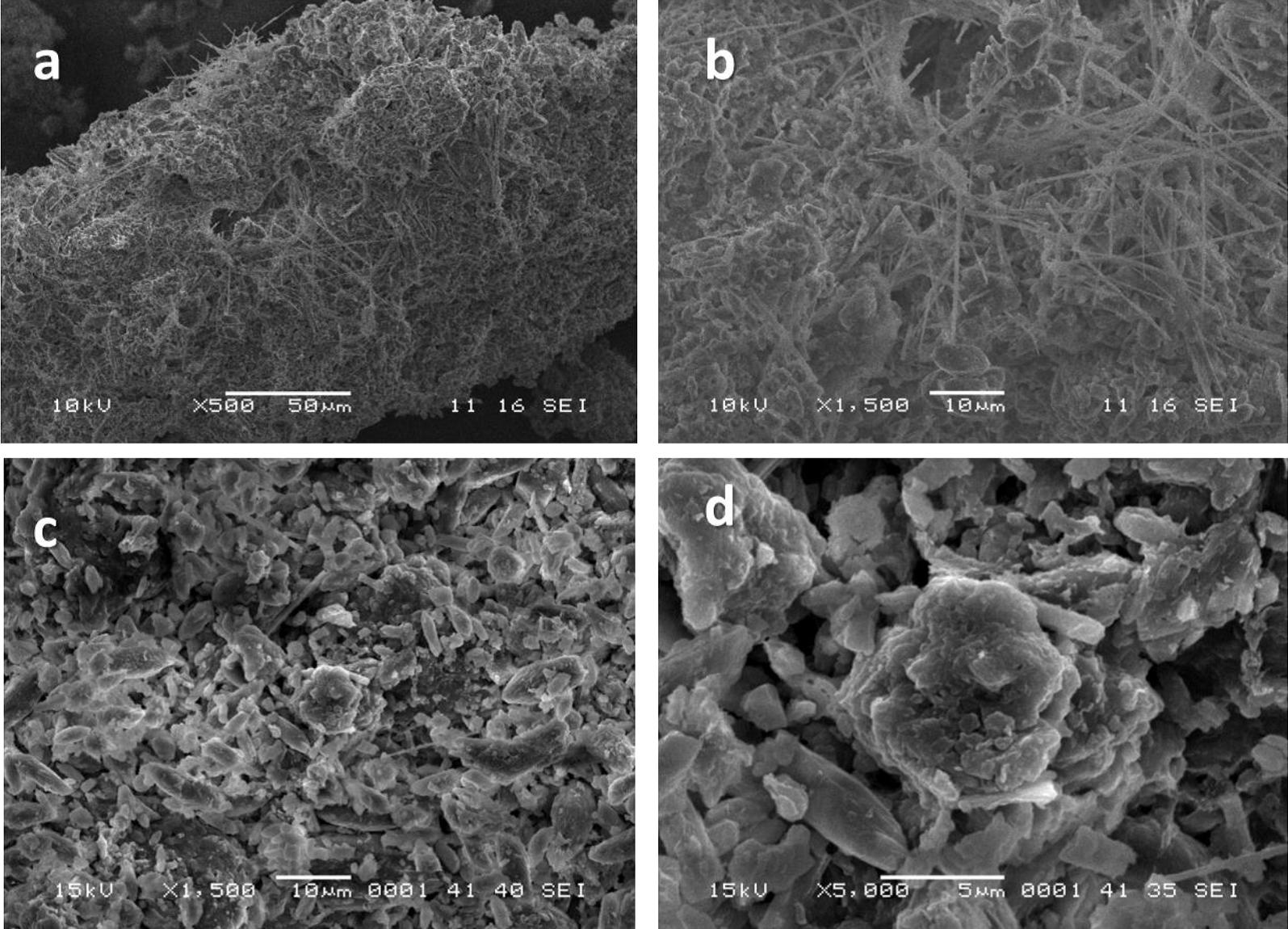 EDX is a method of spectroscopy that is useful in identifying the composing elements of materials; however, it does not reveal chemical bonding information. Hence EDX is more suited for the analysis of inorganic materials, rather than organic materials, which contain for the most part all the same elements bonded differently. For this reason, EDX analysis results carried out to mortar and stuccos revealed high values of C,O and Ca mainly forming part of the stony material namely calcium carbonate, 3(CaCO3) (Sahkab). Although organic materials cannot be reliably identified using EDX, it can bestow a broad idea about the possibility of encountering organic molecules that can be useful to localize characteristic structures and allow a comparison and potential identification of them supported by additional characterization techniques such as FTIR. Previous studies carried out by Ruiz Martín (2010) on endemic trees in Yucatan peninsula such as Pixoy, Chucúm, Chacá and Jolol indicated that resin extracts from those trees were used by Mayan builders as adhesive in their building constructive materials. Therefore, is highly possible that organic substances are also being sensed by EDX as fragments of the analyzed samples. Figures 3a and 3b show SEM images examination in mortars and stuccos, which determined the presence of nanometric clayey material such as Palygorskite displaying a long and tubular morphology. These nanoclays are reported to be found in the south west of Yucatan State and are associated to tertiary calcareous material that are exposed as fine Palygorskite lentils. They use to be found along Sepiolite in larger amounts. Those mineral formations are due directly to precipitation of marine waters (Martín, 2002).