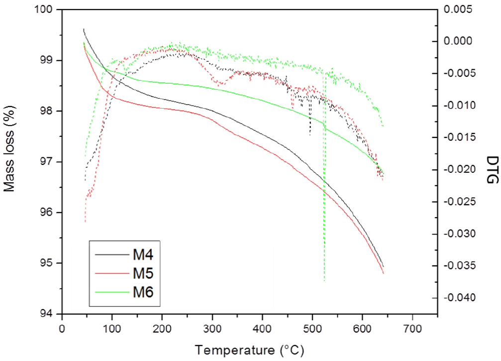 Figure 4 presents TGA analysis results performed to mortar and stuccos. This study allows estimating the possible presence of organic material in the analyzed constructive materials. Results exhibited in Figure 4 identified a mass loss between 3 and 5% in samples indicating elimination of humidity around 70°C, then and apparent stabilization is seen until 250°C where initiates a stage in which a notorious declination in the curve appears indicating organic mass loss until 600°C. Mineral solid residue remains after the test (96%).