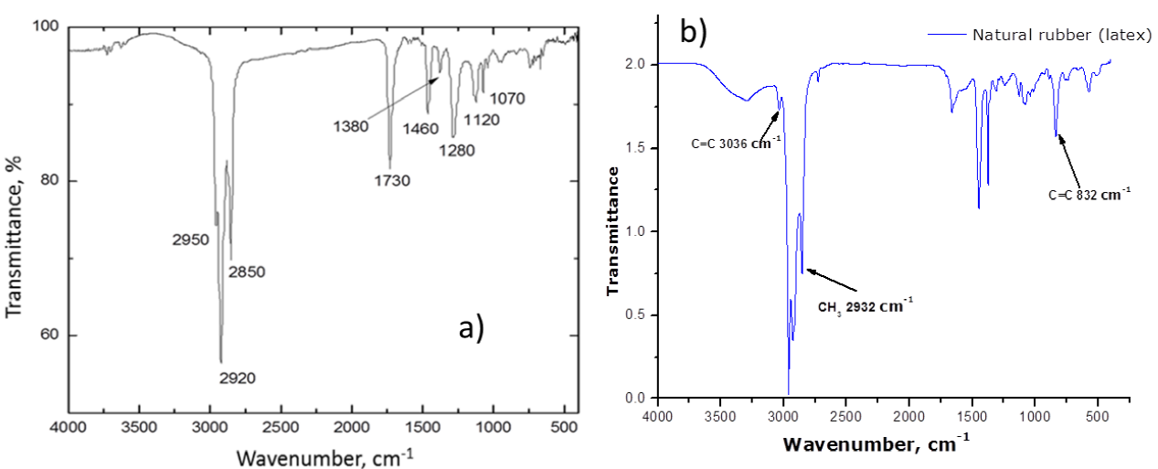 Archeological mortar samples underwent Soxhlet extraction in order to separate and obtain possible organic component present on them. A yellowish waxy residue was acquired to be analyzed qualitatively by FTIR and 1H NMR techniques. As shown in Figure 5a the FTIR spectrum exhibits bands at 2950, 2920 y 2850 cm-1, which are typically associated to C-H stretching of methyl and methylene groups. Bands at 1460 y 1380 cm-1 related to bending vibration confirm the existence of these groups. A signal in carbonyl zone at 1730 cm-1 suggests the presence of ester groups which is also supported by C-O stretching bands at 1280 cm-1. Natural latex used to elaborate the experimental mortars was also analyzed by FTIR in order to identify functional organic groups and correlate them to original stuccos characterization (Figure 5b). C-H bands, typically associated to methyl and methylene stretch vibrations were observed at 2932 cm-1. At 1460 cm-1 additional bands, related to bending vibrations, confirm the presence of such groups. Esters groups were also observed at 1730-1750 cm-1and 1280-1300 cm-1 linked to C-O stretching vibrations. Additionally, the presence de of bands associated to C=C a 832 cm-1and 3036 cm-1, suggest the occurrence of isoprenoids, characteristics of natural rubber cis 1-4 isoprene.