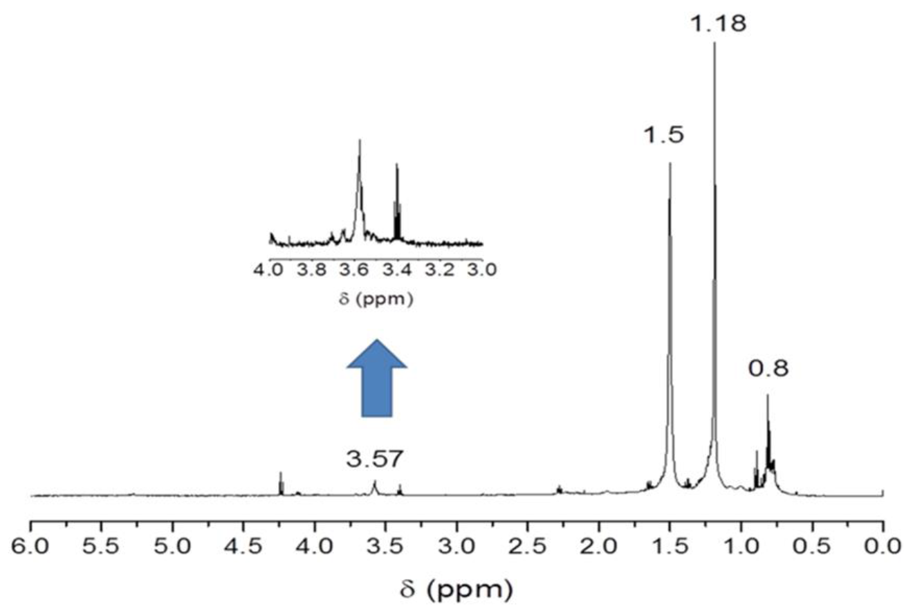1H NMR spectrum displayed in Figure 6 exhibits intense signals at 1.5, 1.18 y 0.8 ppm along with a weak signal at about 3.57 ppm. Signal at 0.8 ppm is generally associated to methyl group terminal protons in hydrocarbonated chains. On the other hand, signals at 1.18 and 1.5 ppm can be related also to methyl group protons affected by different environments. Band at 3.57 ppm could also be due to methylene protons but bonded to an oxygen atom (as in an ester group as shown in FTIR) which promotes the signal location to be lower due to the electronegativity of O.