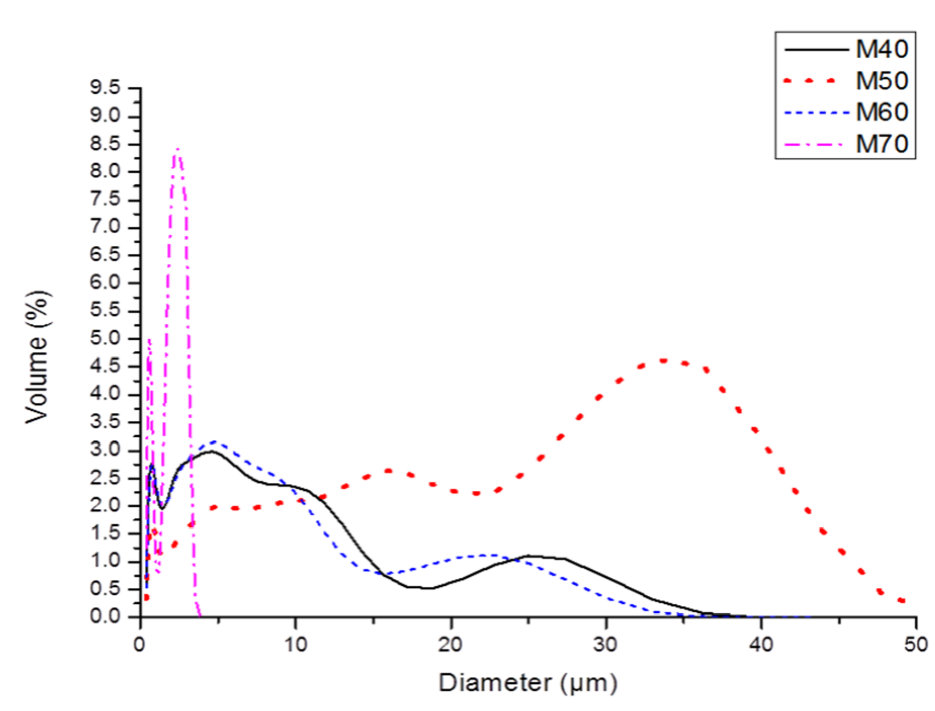 Experimental mortars were elaborated following the sieving of calcareous stone powder (Sahkab). Figure 7 exhibits the particle size distribution where is notorious the diminishing of powder dimensions when the mesh size augments. For this analysis a Coulter counter equipment was used by placing the particles in question into distillated water presenting a hydrophilic character that generates a rapid absorption by the sample and continues changes in the particles affecting the determination of its average size. Despite such variations, results displayed in Figure 7 gives a comprehensive impression of the majority distribution and the differences between the sieved particles. Sieve number 70 presented the lower particle size meaning a higher contact surface.