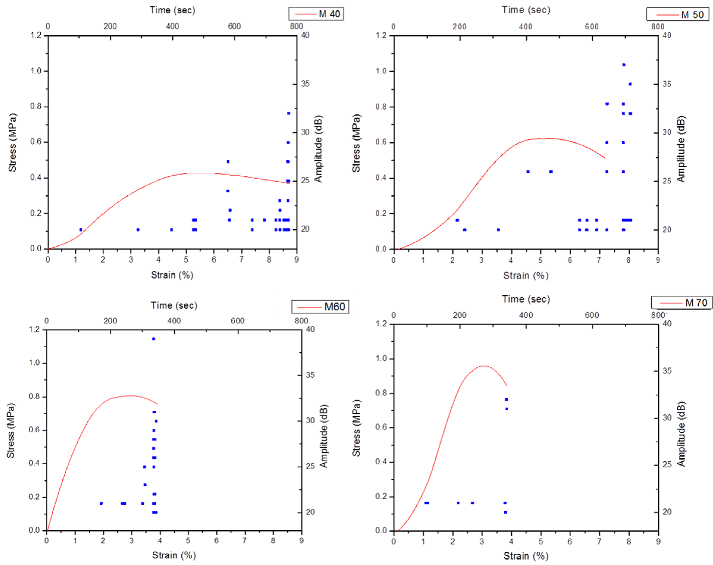 Acoustic emission signals displayed in a representative stress-strain-AE amplitude curves in Figure 8 exhibit those events involved in experimental mortars compression tests. Mechanical damage events are intimately related to signal characteristics such as amplitude, energy, etc. The amount and type of events also depends on failure mechanisms from crack initiation and propagation until fracture. Results determine that amount of events are low in all cases since the mortars are porous materials they are fractured rapidly with the first internal cracks. Mortars made of 60 and 70 sieve particle size showed lesser events with lower energy.