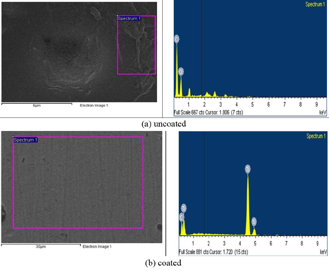 EDX is an analytical technique used for the elemental analysis or chemical characterization of a given sample (Al-Jaroudi et al., 1991). Energy Dispersive X-ray analysis was carried out on the coated surface of bearing steel to find the composition of the elements present in it. Figure 11 shows the Energy-dispersive X-ray spectroscopy (EDX) for both coated and uncoated samples. From the figure it is found that the coated TiCN film contains 83.63 weight% of titanium and 16.37 weight% of carbon. Nitrogen is comparatively in negligible amount. The high Titanium content present in the bearing steel provides higher wear resistance and low friction coefficient and the carbon content present further leads to corrosion resistance and excellent wear characteristics.