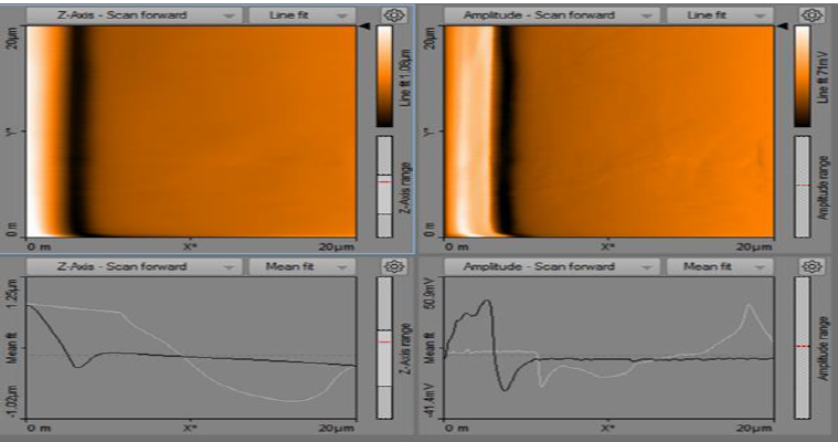 During coating, process parameters such as gas flow rate, growth temperature, and total pressure etc were monitored. The flow rate of CH4 was maintained at 0.5 to 3 liters per minute. The distance between activation heater and the substrate was maintained at 3.5 to 6.0 mm. Total pressure was kept at 20-50 Torr and substrate heater temperature was maintained between 1025 to 1050°C and activation heater temperature range was maintained 1250 to 1450°C. Deposition duration was kept between 30 to 120 minutes. The thickness of TiCN thin films were measured using AFM which revealed the thickness of the coated film as shown in Fig. 2.