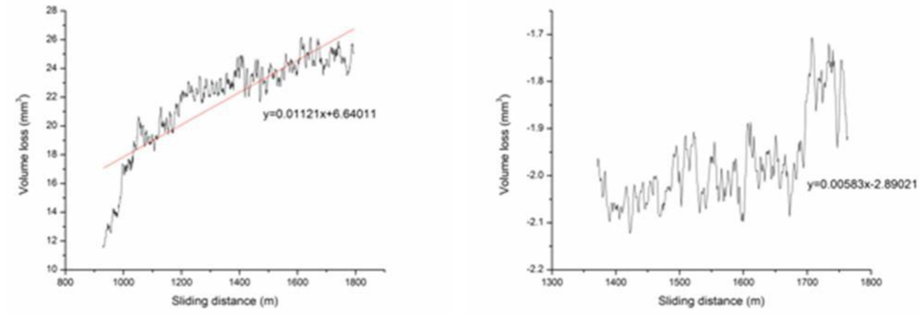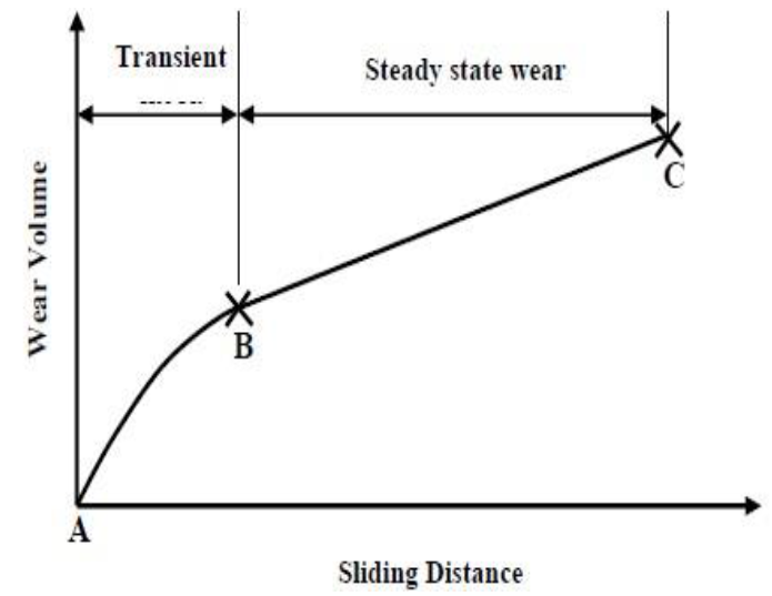 Figure 3 shows a schematic plot of wear volume loss against the sliding distance, depicting the regions of transient and steady state sliding wear for a given sample. Initially the volume loss is curvilinear and the rate of volume loss per sliding distance decreases till point B, beyond which it is constant and follows a straight line BC. The amount of volume loss in the regime given by AB is the unsteady state or transient wear and the wear in the regime BC, is known as steady state wear. In the steady state wear regime, the wear volume loss occurs at a constant rate for an extended duration. The steady state wear behavior of materials is usually expressed in terms of certain wear parameters. The key parameters used in this study for quantifying the dry sliding wear behavior include the steady state wear rate, transient and steady state wear regimes.