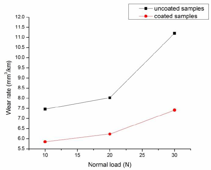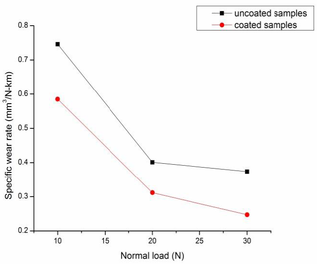 Figure 4 shows the variation of volume loss as a function of sliding distance for both uncoated and coated samples. It may be noted that the rate of volume loss of uncoated specimen per sliding distance increase continuously thus attaining a steady state wear regime whereas in coated specimen the rate of volume loss is decreasing. The wear resistance, wear coefficient, specific wear rate and coefficient of friction were determined and are presented in Figures 5, 6, 7 and 8 respectively. Regardless of sliding velocity and sliding distance the wear rate of both the coated and uncoated samples increased with normal loads as shown in Figure 6. The reason being higher frictional thrust is obtained at increased load. With increase in carbon content of the coated specimen the material stiffness increases with decreasing deflection. The specific wear rate decreases with increase in applied normal load. It is observed that for higher loading conditions and increase in the sliding speed, the specific wear rate further decreases as shown in Figure 7.