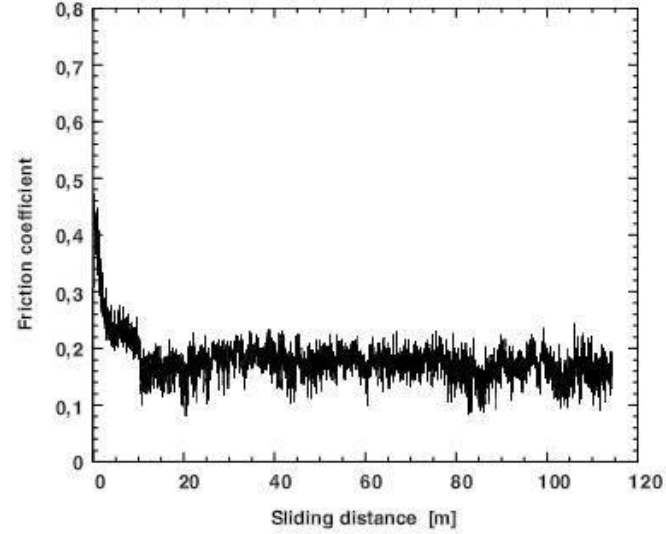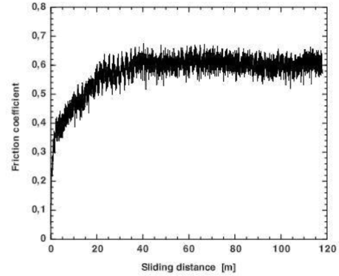 Figure 7 and 8 shows the friction plot obtained from pin-on-disk test for both uncoated and coated bearing steel ball specimens. Manipulating the amount of different elements strongly influence the properties and behavior of the resulting coating on the bearing specimen. TiCN coating contains a surplus of carbon that has not reacted with the metal. TiCN coated samples has shown promising results with low friction and increased hardness and wear resistance. From the Figure 8 it follows that the friction starts at approximately 0.3 which is typical for an uncoated bearing against steel contact and then it increases to 0.65 which is typical for a selfmated bearing steel contact where as in the coated samples the friction starts at 0.4 initially and goes on decreasing to 0.2 as shown in figure 9. Initially the wear of the specimen is relatively large for coated specimen because in the beginning of the pin on-disk test the contact spot between the ball and the TiCN coated bearing is small and consequently the pressure is high.