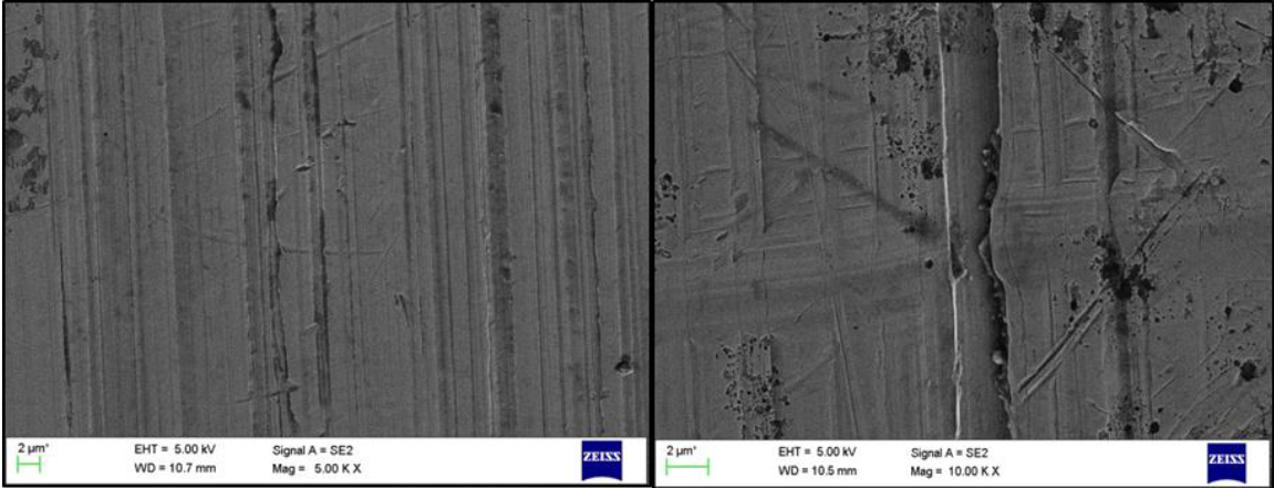 The coated and uncoated bearings were examined using a scanning electron microscope (JEOL Model JSM - 6390LV, Tokyo, Japan) to view the surface and cross section views. For this the samples were vacuum dried initially. High resolution and magnification of surfaces of materials can be obtained by scanning electron microscope (SEM) while EDX provides detailed profiling of elements present on a particular surface.