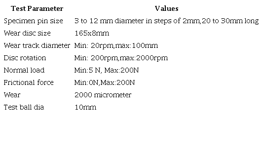 For this purpose, uncoated roller bearing specimen made of bearing steel was polished against 600-grade SiC paper to obtain specimens having a cross section of 10 x 10 x 20mm. A disc made of hardened chromium steel (EN-31, hardness 62 Rc) was used as the counter body against the pin. The specimen is held stationary and the disc is rotated while a normal force is applied through a lever mechanism. This acts as the counter face to wear against the composites coating. Prior to tests, both pin and disc were polished to have a uniform surface roughness. A computer aided data acquisition system was used to simultaneously record both height loss and frictional force, with the volumetric loss being calculated.