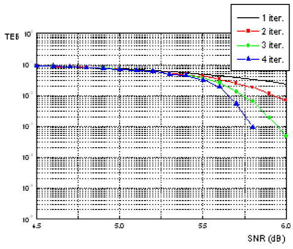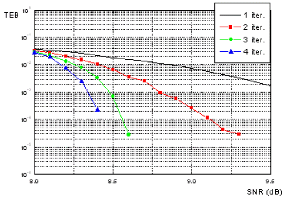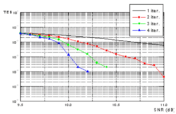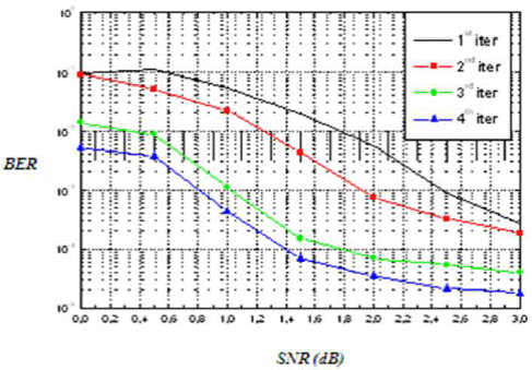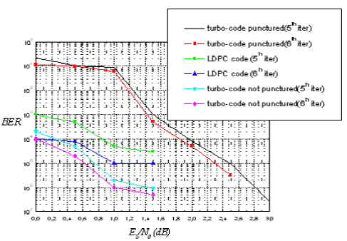 If you choose a SNR in 1 dB, in the fifth iteration, the BER of the turbo-code not-punctured is 1.10-6, the BER of the turbo-code is punctured is 6.10-2 , through against the BER of hybrid LDPC code is 3,5.10-5. In this figure, we noted that the hybrid LDPC code remains attractive although the turbo-code not-punctured is better.