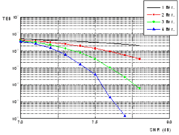 The Figure 10 shows the simulation results evaluated by the Binary Error Rate (BER) on Gaussian channel for a turbo code. We note in this figure the importance of the reaction against the reception level which results in the iterative effect.