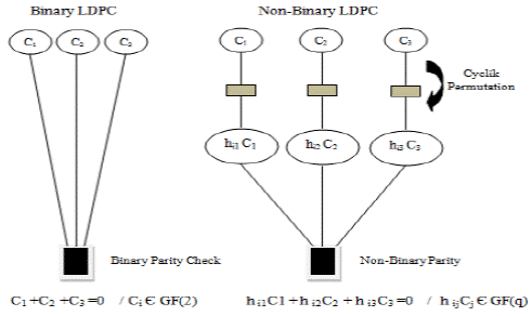 Either binary LDPC hybrid or non-binary codes. They are described with the parity check equation which corresponds to the i-tհ row of the matrix H, and is given as follows (Richardson, Shokrollahi, & Urbanke 2001):