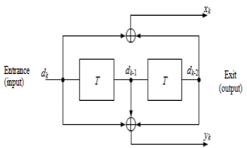 The Figure 6 is an example of a convolutional encoder of yield R =1/2 and constraint length μ = 3 (Bassou. 2000). Its input consists of blocks of binary symbols ne= 1 and the output of blocks of ns = 2 symbols.