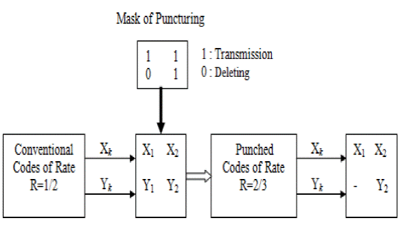 For example, conventional punched codes are obtained from a code of rate 1/2 by deleting "no transmission" Periodic Xk and yk values, following a "mask" suitable punching indicating the positions of the symbols to be deleted.