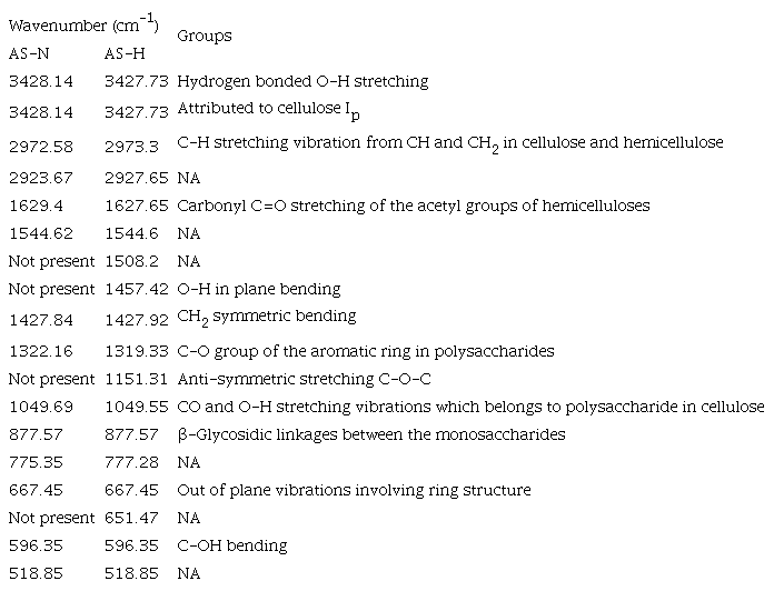 Figure 4 shows the FT-IR spectra of AS-N and AS-H samples. The absorption bands observed were identified as follows: a wavenumber of 3428 cm−1 indicates the presence of OH groups on the AS-N and AS-H samples. The 1628 cm−1 band is a result of CO stretching mode, conjugated to a NH deformation mode and is indicative of amide band. The CO or CN groups were assigned to the band at 1049 cm−1.Thus, this spectrum reveals the presence of several functional groups which could be bonded to Ni(II) chemical species on the AS-H surface, among others carboxylic and hydroxylic groups. The AS-H presents similar bands to those of AS-N (Table 1). No modification in the IR spectra of AS-H after the Ni(II) uptake were observed. Agave americana presents a similar IR spectra (Kestur et al., 2013) to that of Agave salmiana.