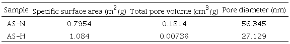 The total pore volume and pore diameter is low for AS-H than AS-N samples. These variations in the textural characteristics of the samples could be attributed to the washing with the HCl solution.