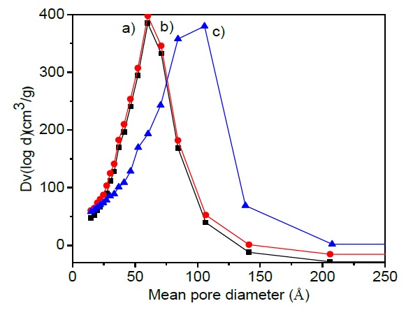 Textural properties were measured by N2-physisorption technique using an ASAP 2020 equipment from Micromeritics. The surface areas were calculated using the Brunnauer-Emmet-Teller (BET) equation. The adsorption-desorption isotherms were used to determine size (Kelvin equation) and shape of the pores. The total pore volume was measured at relative pressure (P/P◦) equal to 0.99. All samples were degassed out at 250◦C during 3 h (5 µm de Hg) previous to N2-physisorption analysis.