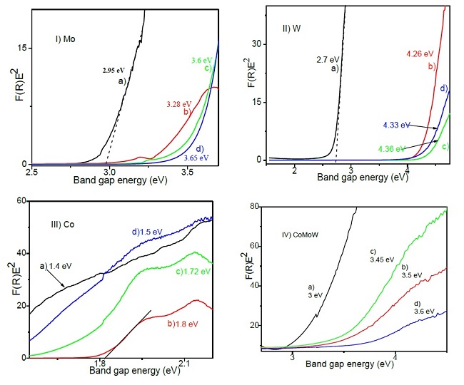 Additionally, DRS spectra show a broad band al longer wavelengths, composed for at least three signals peaking at 541, 580 and 638 nm, characteristic signals of supported cobalt with tetrahedral symmetry (CoAl2O4) indicatives of the interaction between Co and the support suggesting the formation of a new compound (Mendoza-Nieto, Vera-Vallejo, Escobar-Alarcón, Solís-Casados, & Klimova, 2013). The DRS spectra of each CoMoW catalyst were treated using the Kubelka-Munk method to obtain the absorption edges and to transitions as was reported by Weber (1995). It was assumed that this value near neighbor’s correlations. Figure 6.I) shows a red shift of the absorption edge of the polyoxomolybdates supported on Al2O3, Al2O3-MgO, Al2O3-MgO-Li2O respect to the unsupported MoO3. It is clear that unsupported MoO3 shows the lowest band gap energy, 3.0 eV, due to its high agglomeration; when molybdenum is supported on Al2O3, Al2O3-MgO, Al2O3-MgO-Li2O higher band gap energies are found, 3.5, 3.4 and 3.6 eV, respectively, suggesting that support containing magnesium and lithium favors the molybdenum species dispersion. Figure 6.II) shows the absorption edges of tungstates supported on Al2O3, Al2O3-MgO, Al2O3-MgO-Li2O respect to the unsupported WO3; WO3 has a band gap energy of 2.7 eV due to its high agglomeration and when is supported on Al2O3, Al2O3-MgO, Al2O3-MgO-Li2O the band gap energy increases from to values 4.2, 4.3 and 4.4 eV respectively; again, this is indicative of the good dispersion of W due to the modification of the catalytic support. In the case of cobalt, the effect of agglomeration on the band gap energy is less evident, the Co3O4 has a small value of 1.4 eV, whereas the cobalt impregnated on Al2O3 support shifts to 1.5 eV, and for the Co supported on Al2O3-MgO and Al2O3-MgO-Li2O the corresponding values are 1.8 and 1.7 eV as it is seen in Figure 6. III). The CoMoW impregnated on Al2O3-MgO-Li2O have a slight shift in the absorption edge to 3.6 eV Figure 6. IV), which indicates a good dispersion of the catalytic active phases in this support, that could be most related to the impregnating solution containing metallic citrates to enhance metallic dispersion. The absorption edges of these metal oxides show that larger aggregates have the lower energies as in (Weber, 1995). This band gap energy values indicate the good dispersion of the octahedral Mo and W species towards the tetrahedral species, which is in agreement with the dispersion suggested by the XRD and Raman results.