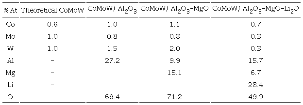 CoMoW catalysts supported on Al2O3, Al2O3-MgO and Al2O3-MgO-Li2O were characterized in the oxidized state, determining their elemental chemical composition. X-ray photoelectron spectroscopy (XPS) using a JEOL JPS 9200 XPS was employed to determine the elemental content in each sample. Wide and narrow spectra were acquired using a Mg K( X-ray source with a pass energy of 30 eV, dwell 200 and 10 scans. Base line sustraction was done with the integral background of the Shirley-type model. Charge correction was required to interpret the true chemical shift, as an energy reference was used the adventitious carbon by setting the binding energy of C 1s to 285 eV. From photoelectron spectra were quantified the atomic elemental composition for each sample using the Specsurf software and their relative sensitivity factors, derived empirically and valid for the JEOL JPS 9200 spectrometer.