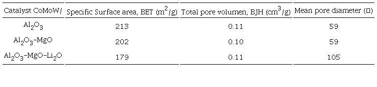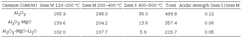 X-ray photoelectron spectroscopy data showing the atomic composition are shown in Table 1. It is seen the presence of Mg and Li in the corresponding catalysts in amounts close to 5 % at. In general terms the composition data seem to be congruent to the theoretical expected. Also was expected that the addition of Mg and Li increases basic sites and consequently decrease the acidity in the concentration of acid sites as in their strength. This was measured by the total decrease in the concentration of NH3 desorbed, indicating a decrease of the number of acidic sites. Table 2 shows the NH3 concentration thermodesorbed at three different intervals of temperature corresponding with sites of different strength. The interval from 120 to 200 °C can be associated with weak strength sites (sites W); from 200 to 400 °C can be related with medium strength sites and from 400 to 500 oC correspond to strong strength sites. It is clearly seen that incorporation of MgO decreases approximately by 28.5% the total concentration of acidic sites whereas the simultaneous incorporation of MgO and Li2O diminish almost 56.8 % the total concentration of acidic sites. The acidic strength considered as the ratio of the concentration of sites S to the concentration of sites M, decrease from 0.12 for Al2O3, to 0.06 and 0.05 for the catalysts supported on Al2O3-MgO and Al2O3-MgO-Li2O, which represents a decrease of 50% and 58 % of acidic strength respectively. It is important to remark that the number of acidic sites and their strength will change the dispersion of precursors of active phases, it is probably that will be more agglomerated species in the catalysts supported on Al2O3 than in the other catalysts.
