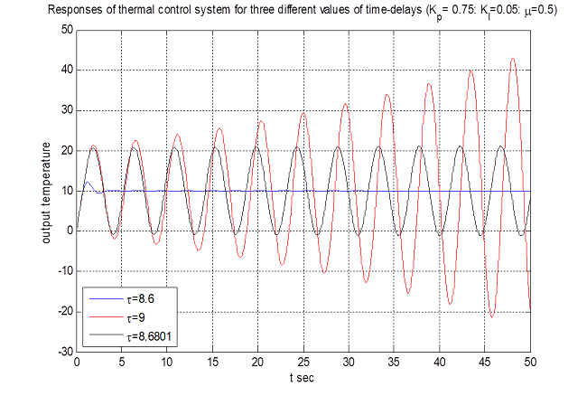 The temperature control system with time delay as stated in the Theorem 1 was executed for various range of PI controller gain (, and the maximum value of were obtained and tabulated (Table3). In the result were , chosen and obtained the maximum value of time delay is 8.6801seconds. It was found that the system becomes unstable, even when the delay margin increases to the value of 9 seconds. This result clearly brings out the effect of delay on the delay-dependent stability of the temperature control system as shown in Fig.4. Hence, when compared to earlier theorems (Parlakci, 2006; Shao, 2008,2009) the results presented in this paper portray a more realistic system operating condition and the proposed stability criterion has less number of decision variables compared to the earlier results as given in Table 8.