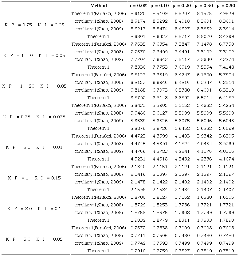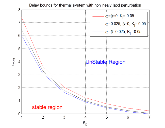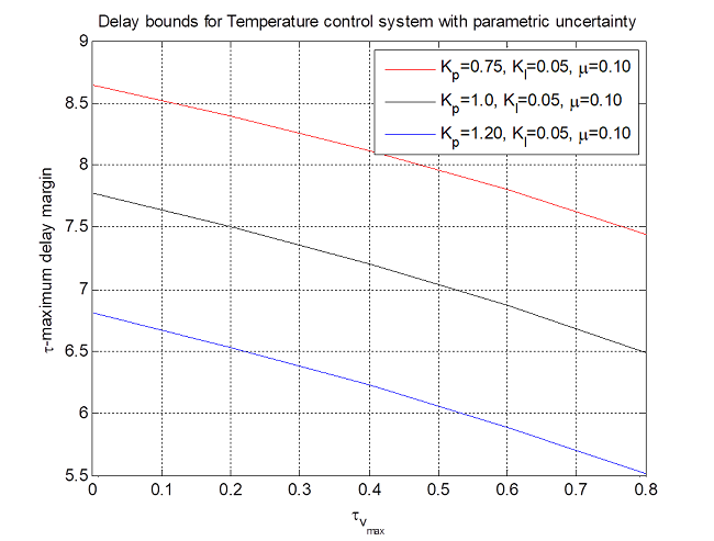 In this section, the temperature control system with parametric uncertainty (parametric variation i.e. time constant of valve is varying with respect to time) are demonstrated and the applications of the Theorem 3 are presented, in order to show the effectiveness of the new robust stability criteria. The maximum value of the delay bound is calculated for temperature control system for various values of , and for various controller parameter gains settings (viz, and ); they are listed respectively in Table 7. From the tables, it is clear that as the value of increases, the parametric variation effect on the temperature control system become more pronounced as shown in Fig. 6, and under such parametric uncertain temperature control system conditions, the maximum network delay that the PI controlled temperature control system can withstand without losing stability decreases. This result clearly brings out the effect of parametric variations on the delay-dependent stability of the temperature control system. The results present in this paper depict a more realistic system operating conditions.