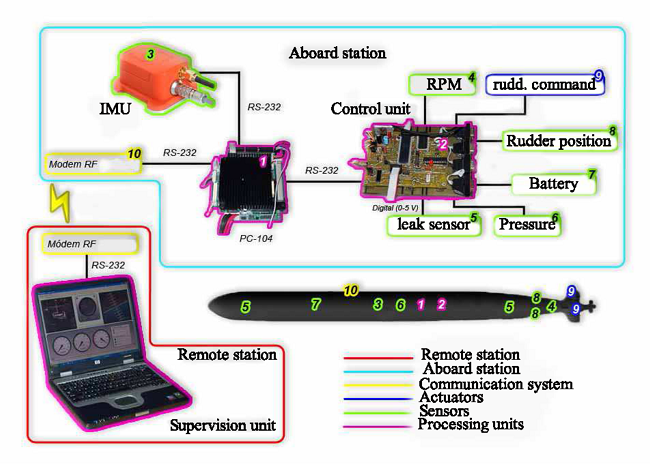 The latest design for submersible vehicle developed in cooperation between the Cuban Hydrographic Research Center (HRC) and the Group of Automation, Robotics and Perception (GARP) is called HRC-AUV. The primary envisioned missions of the prototype are environmental surveying andoceanographic data acquisition in coastal zones. Therefore, the vehicle is designed for small depths and medium endurance until depths lower than 10 meters. The length of the vehicle is approximately 9.5 m, has a diameter of 0.8 m and nominal cruising speed 1.9 m/s. The HRC-AUV uses a single main thruster for propulsion, steering and depth are controlled by two control rudders placed at stern and electrically driven. Fig. 1 shows schematically the hardware items comprised in the last version of the system after an update in 2014 Martínez et al. (2013).
