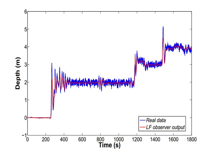 In modern Dynamic Positioning (DP) and Autopilot Systems for marine vessels, the terminology low-frequency (LF) is used to refer to the states corresponding to the motion due to the action of the actuators and on the other hand, wave-frequency (WF) states represent the wave-induced components Fossen and Pérez (2009) and Shi, Shen, Fang, and Li (2017). For years, various techniques for wave filtering were investigated, including lowpass filtering, notch filtering, and dead-band techniques. These filters had limited success when high-gain control is required, which affect the performance of the DP system. Filters that exhibit better performances are those based on vehicle model and a wave induced motion model combined within an observer. For these purposes, the Kalman Filter is the preferred observer but it is computationally more intensive and the tuning procedure is difficult because a priori information of the process and measurement noise covariance is required Fossen (2011). Examples of wave force compensation by using a Kalman Filter framework are shown in Fossen and Pérez (2009), Wirtensohn, Schuster and Reuter (2016), Rigatos, Raffo and Siano (2017). In Dantas et al. (2014) the wave disturbances on the diving plane were filtered away by a shaping filter fitted to the sea spectrum and the sensor signals were integrated by an Extended Kalman Filter (EKF). In the work Wirtensohn et al. (2016), an Unscented Kalman Filter for performing disturbance estimation and wave filtering is investigated. Nonlinear passive observers also have been used to estimate parameters of the waves Refsnes (2007) and Belleter, Galeazzi and Fossen (2015). In general they are difficult to tune due to the number of parameters involved and the global stability is not guaranteed in all cases.The principle of combining inertial and depth measurements within a nonlinear observer has also been used for submersibles in Schmidt, Raineault, Skarke, Trembanis, and Mayer (2010).