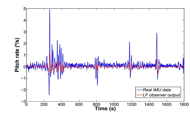 It is seen from the plots that most of the 1st order waves disturbances are filtered out, resulting in smooth estimates of the depth and pitch rate. Hence, the feedback controller should not be too much affected by the rough sea condition.