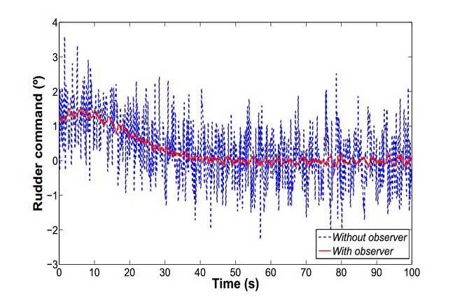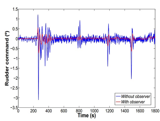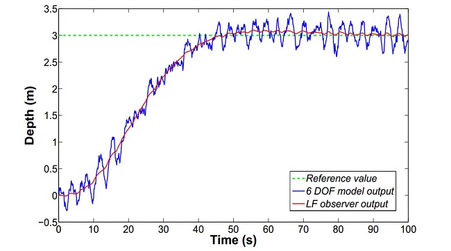 In Table 5 a comparison among statistical values of the rudder control signal is displayed when the LF observer outputs are used in the depth control. The wave frequency components are filtered out, reducing energy consumption and increasing the life time of the actuators.