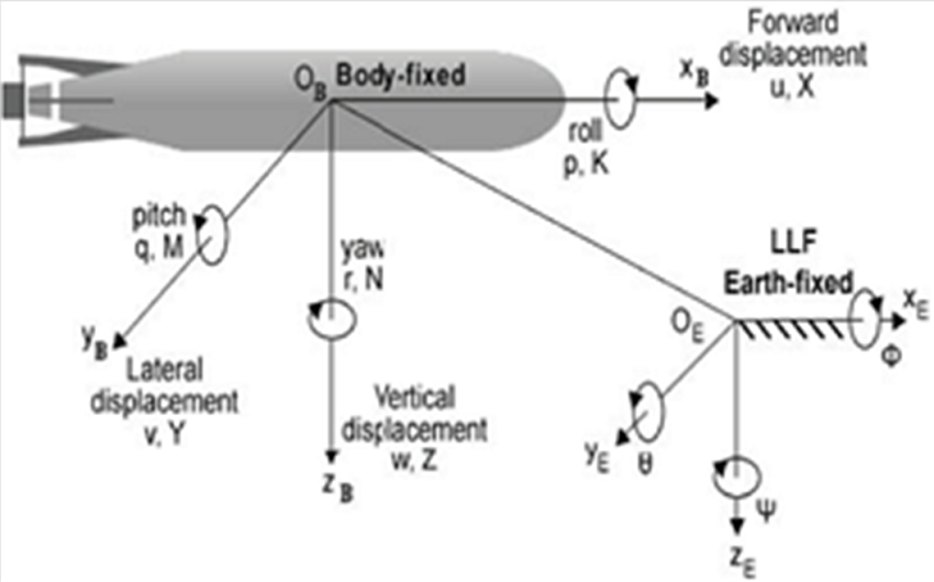 The HRC-AUV moves at low speed of 1.9 m/s thus the rotation of the Earth can be neglected and the Earth-fixed reference system can be considered as an inertial frame and a North, East, Down (N.E.D.) the navigation frame. Fig. 2 depicts the coordinate systems and the definition of translation and rotation variables used. In addition, the nomenclature used to represent the position, velocity as well as forces variables of the HRC-AUV is shown in Table 1, which is the recommended notation used on maneuvering and control of submarines according to the standard SNAME (1950).