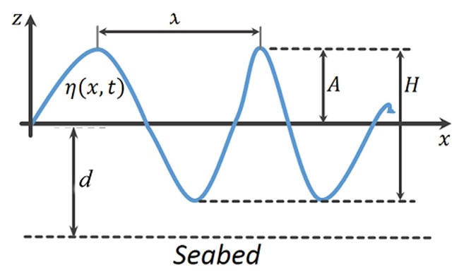The -axis coincides with the direction of propagation. In order to fully specify a regular wave, it is needed its amplitude , its wavelength , its period and its propagation direction and phase at a given location and time. Then, the elevation is defined according to the expression: