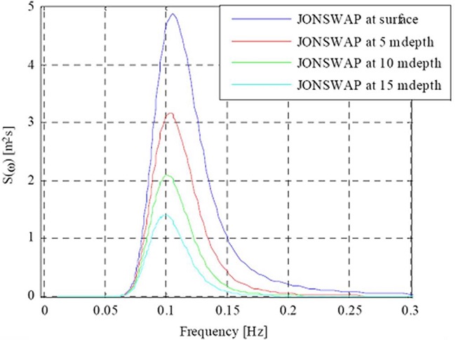 According to the Expression (15), a demonstration of how the Jonswap spectrum of surface waves attenuates with depth is shown in Fig. 4.
