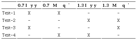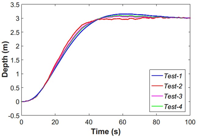 For testing variations due to vehicle model changes, the parameters and directly related with the depth/pitch dynamicsare varied 30% over their mean values. These parameters are selected as center of the variation due the structure of the model used for the observer and the complexity in its determination (through experimental sea test). In Table 4, the different combinations of these parameters and the results achieved by the depth/pitch control in Figs. 9 and 10 are presented.