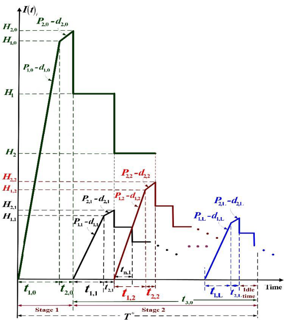 In each stage, the manufacturing processes may generate xi portion of defects randomly, at a rate d1,i ; so, (where d1,i = xiP1,i & i = 0, 1, 2, …, L; please note that i = 0 means the process is in stage 1 fabricating common parts). All stocks are inspected and a θ1,i proportion of the defective items is identified as scrap (please note that 0 <= θ1,i <= 1) and the other portion (1 - θ1,i ) can be repaired via rework process in each cycle when of regular process ends, at a rate P2,i (Figure 1).