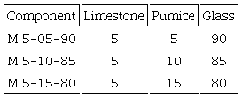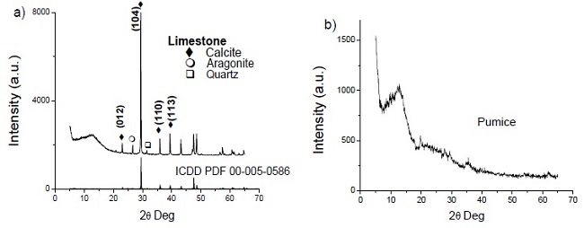 Raw materials were characterized through XRD to identify the present phases. Fig. 1 shows that limestone mainly contains calcium carbonate in the form of a calcite phase. The diffraction pattern confirmed its presence when it was compared with an ICDD reference PDF 00-005-0586, presenting the principal peak (104) at 29.44°. The sample also contains calcium carbonate in the form of aragonite and quartz (SiO2) as an impurity. The pumice sample presented an amorphous diffraction pattern because this mineral is a volcanic glass (Correcher, Gomez-Ros, Dogan, García-Guinea, & Topaksu, 2017). The source of the used glass was obtained from a waste of amber glass bottles.