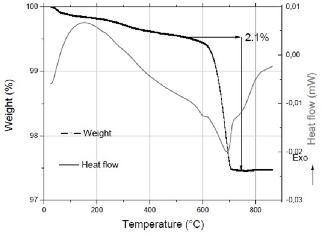 To verify the formulation behavior and sintering performance, some TGA-DSC analyses were performed to the 90-5-5 sample (Fig. 2). The thermogram showed a loss of weight in the temperature range of 580-700°C. In this region, CO2 is produced because of the thermal decomposition of calcium carbonate as is showed in the chemical reaction: