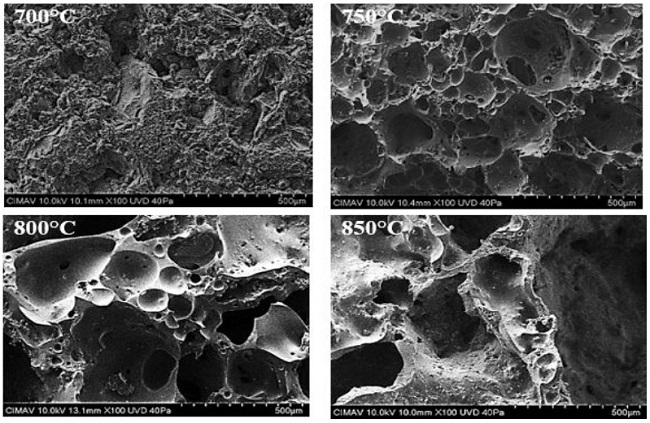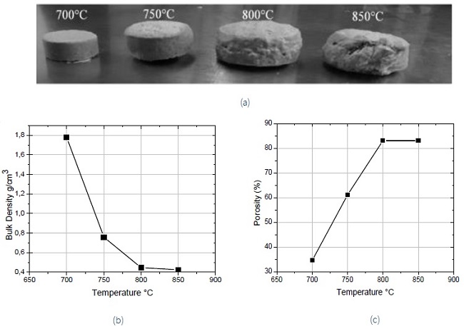 Once the optimal formulation was obtained, some sintered samples were prepared using sintering temperatures of 700, 750, 800 and 850°C with a furnace and a holding time of 20 minutes. The SEM micrographs of Fig. 3 showed an increased porous generation as a temperature rise in the 5-5-90 sample. It is noticeable that at 700°C, no pores are formed yet, the 750°C sample showed an incipient porosity generation in the form of small pores. At 800 and 850°C, pores increased their sizes because small pores communicate with each other forming larger pores. In the graphs of Fig. 4b the measurements of bulk density are displayed, it is observed that the 700°C sample had a value of 1.7 g/cm3, this indicates that carbonate decomposition does not happen yet and is corroborated in Fig. 4a where it is noticed that the sample had no apparent expansion. The minimum reached density values were 0.42 and 0.44 g/cm3 for temperatures of 850 and 800°C, respectively. The nominal difference between these two samples was minimal, so it was decided to use the lower sintering temperature (800°C) to evaluate the effect of holding time in the furnace to sintered samples. A critical disadvantage of sintering at a higher temperature (850°C) is the economic aspect translated as energy and investment-related costs. Besides, at a higher temperature, the glass component flows quickly, causing the sample to lose symmetry when it expands, as can be seen in the image of Fig. 4a, where the specimen looked heavily deformed. The graph of Fig. 4c shows the porosity level of sintered samples expressed as a percentage. The highest porosity was 83%, reached at 800 and 850°C.