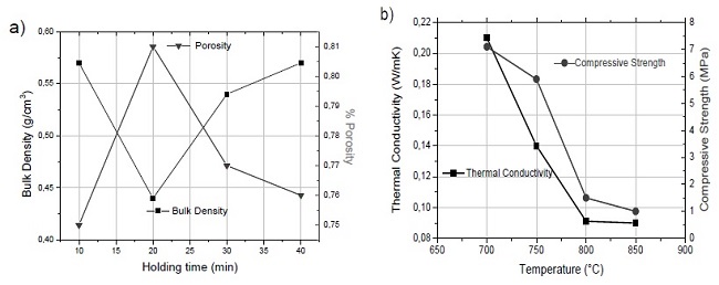 As was mentioned above, the 5-5-90 sample sintered to 800°C was subjected to different holding times in the furnace. In Fig. 5a, it can be observed that a minimum value of bulk density was reached after 20 minutes of heating, obtaining the highest porosity percentage (81%). In the graphs, there is no significant difference in bulk density and porosity under different sintering times. It was observed that after 20 min, the samples begin to densify; this is probably due to glass creep that clogged the pores and deformed the sample simultaneously. The thermal conductivity is shown in Fig. 5b, as can be seen, these results have a direct relation to density, obtaining the lowest values 0.090 and 0.091 W/m K in samples heated at 850 and 800°C, respectively. These values are acceptable when they are compared with commercial polymer-based insulators such as expanded polystyrene and polyurethane, whose approximate values are 0.040 W/m K. As was mentioned earlier, these insulators have the critical disadvantages of not being able to use them in interior spaces because they are highly flammable and present higher involved costs.