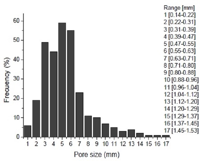 Some compressive resistant tests were performed on sintered samples and their results are shown in Fig. 5b. Similarly, this property had a direct relationship with thermal conductivity. Both properties have great importance for the use of this material as an insulating barrier since this material usually goes as an outer layer and it must resist accidental impacts. Sintered samples at 800 and 850°C have a resistance of approximately 1 MPa; this value is similar to the results reported by Attila, Güden, and Taşdemirci (2013) and Baino and Ferraris (2019), which synthesized similar foams from vitreous materials. The pore size distribution of the 5-5-90 sample was determined and showed in Fig..6, 300 measurements were made and the results were classified into 17 pore size intervals. The range of 0.55 to 0.63 mm was the most frequent, with a value of 59%. The total pore size range was 0.14 to 1.53 mm. A summary of the most important parameters for applications, such as an insulating coating of the 5-5-90 sample sintered at 800°C is presented in Table 4.