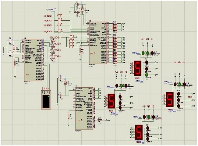 A smart traffic light control system intended for intelligent allocation of right of way based on vehicle densities sensing, allotting of due passage duration time, and overriding feature for emergency cases, is proposed and implemented in this paper. To realize the three set objectives, three PIC 16F877A microcontrollers, one specifically dedicated for each of the three tasks, are deployed for the logic control design. Three PIC16F877A microcontrollers are used to provide enough number of pins for the three tasks. A Proteus Labcenter circuit design of the system was first simulated as shown in Fig. 1 before actual implementation. Each of the microcontrollers is a CMOS FLASH-based 8-bit microcontroller with RISC architecture. The system contains eight pressure (PR) sensors, two each in each of the four roads. The PR sensors are located at a distance between each other such that when both of them experience continuous depression for specified seconds, an overriding signal is logically sent to the microcontroller. To achieve the control design, the microcontrollers are set into operation by writing sets of instructions (using C language) which are assembled and burnt into the microcontroller chip.