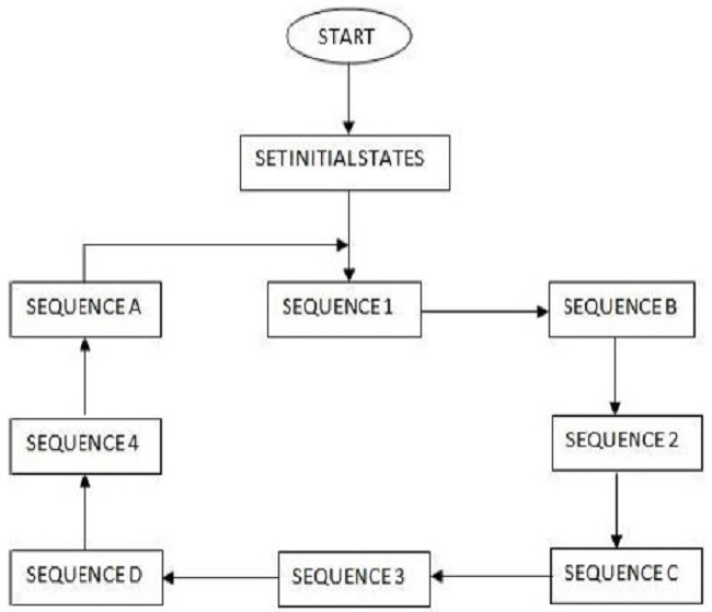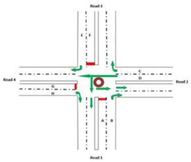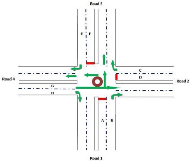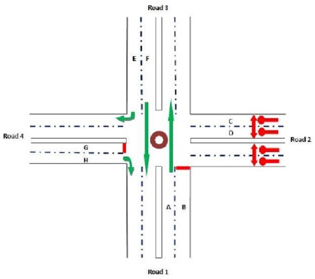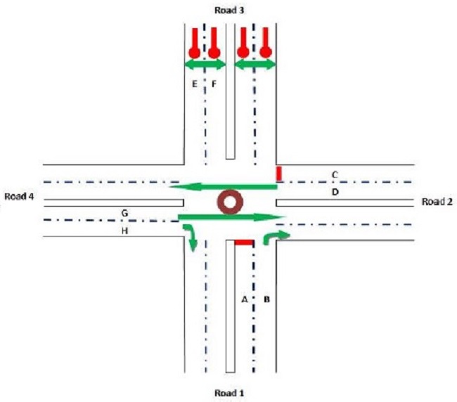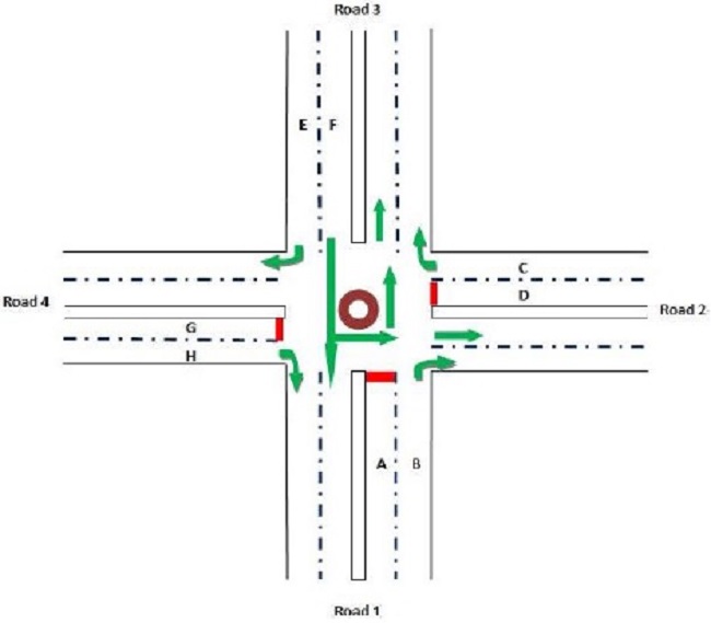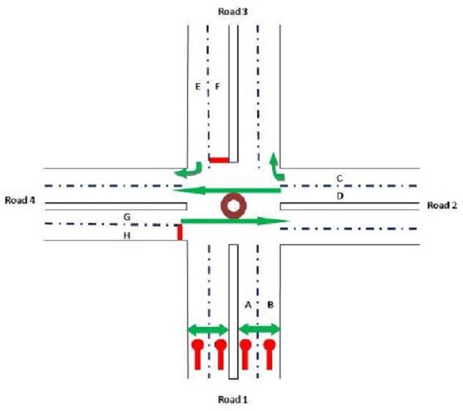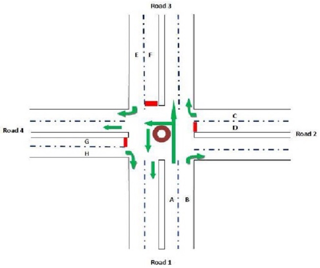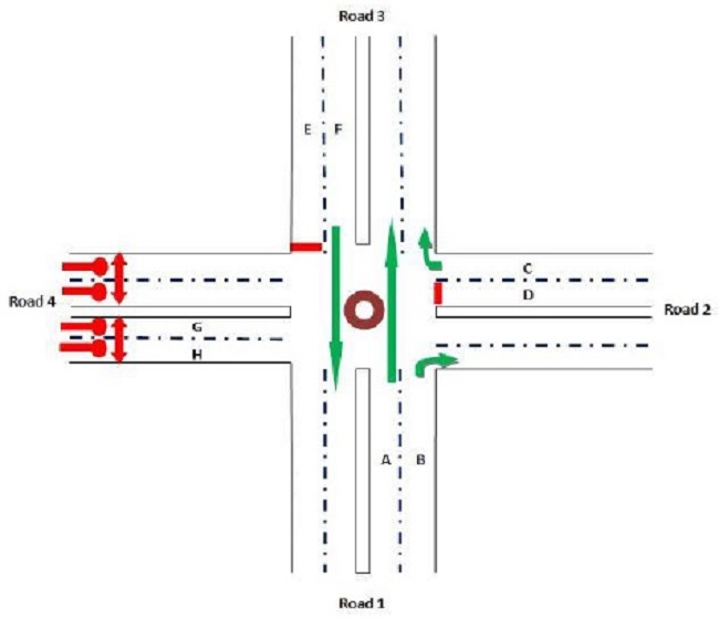 The arrow-headed lines in the phase designs indicate the allowed movement for vehicle traffic in a particular phase while the double arrow lines show the permitted movement of pedestrians. The desired cycle of operation is as shown in Fig. 3 in which the sequences with numbers (1, 2, 3, 4) represent sequence of preferential treatment (right of way) given to the four roads while sequences with letters (B, C, D, A) represent the right of way given to pedestrians. This means that for instance, after road 1 users have been given the right of way, the next sequence is that of the pedestrian crossing for road 1 (sequence B). Pedestrian crossing for road 2 ‘sequence C’ is enabled after right of way for the road 2 users ‘sequence 2’. Another cycle of operation begins after pedestrian crossing for road 4 i.e. ‘sequence A’.