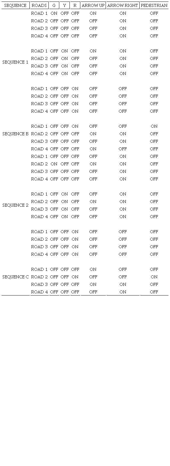 From the phase designs and the desired cycle of operation the truth table for the switching sequences can be developed. The truth Table 1 shows only sequences 1 and 2 for vehicular right of ways and sequences B and C for pedestrian right of ways