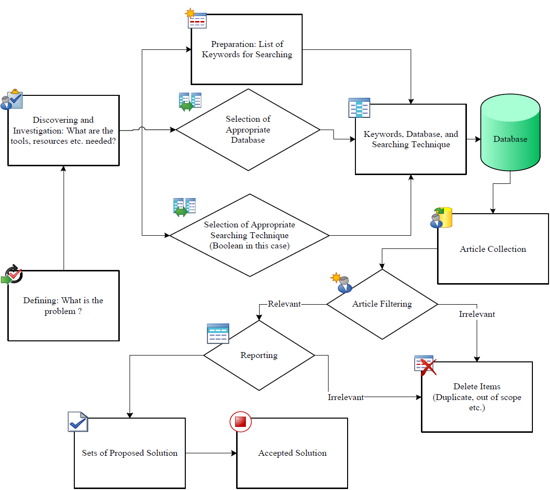 This study has used literature reviews in order to explore the possible pedagogical and application design solution for M-Learning. The steps used in the process are shown in Figure 1. The first step defines the problem, followed by discovering, filtration, and finally reporting. The digital databases explored for problem analysis, relevancy, and possible solutions includes: Science Direct, IEEE xplore, Scopus, and Springer using simple and advanced search. Searching has been conducted individual as well as in combination of search terms. The search terms include: M-Learning application design, learning design, M-Learning design, model etc. Boolean Operators such as AND, OR, *, has been used to retrieve articles from databases. For example, the keywords include "M-Learning design", "learning design", and "model", and application of Boolean search is as follows: (model* OR approach*OR method*OR process*) AND (M-Learning application design * OR learning design *OR M-Learning design*). Although the searching leads to a number of articles however, articles published between 2005 and 2016 with relevance to M-Learning application design have been studied thoroughly.