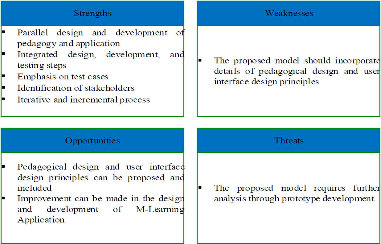The SWOT (Strengths, Weaknesses, Threats, and Opportunities) analysis of the proposed model is shown in Figure 4.