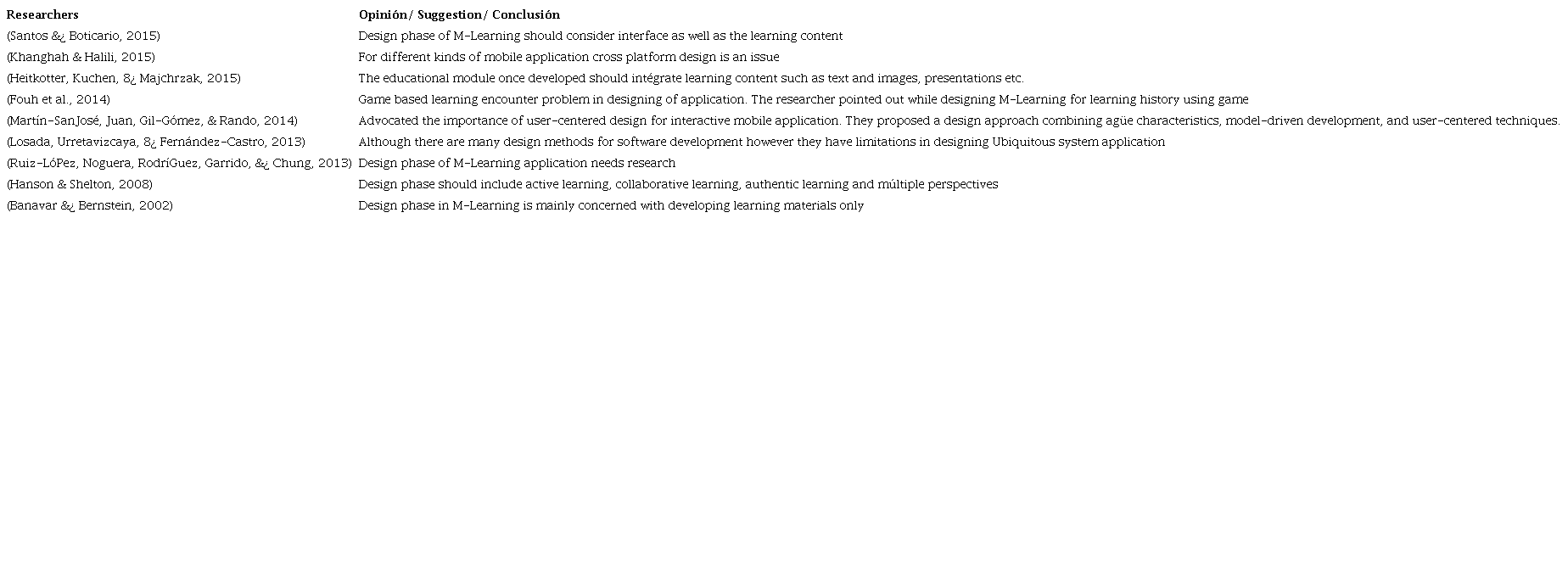 M-Learning materials require a detailed and systematic planning of design and development process (Heinich, Molenda, & Russell, 1989). There are technological and pedagogical challenges such as user interface design, múltiple devices (Mahazir, Norazah. Rosseni, Arif, & Ridzwan, 2015) variation in networks (wireless home área networks (HAN) and wireless wide área networks (WAN), business área networks(BANs) ) (Develi & Kabalci, 2017). The designing of course bring challenges to the course designers (Wu, Lee, Chang, & Liang, 2012). Integration of infrastructure and application is another challenge in ubiquitous application (Stanton & Ophoff, 2014). The summarized output of extensive analysis of the articles on M-Learning design is shown in Table 1 and 2.